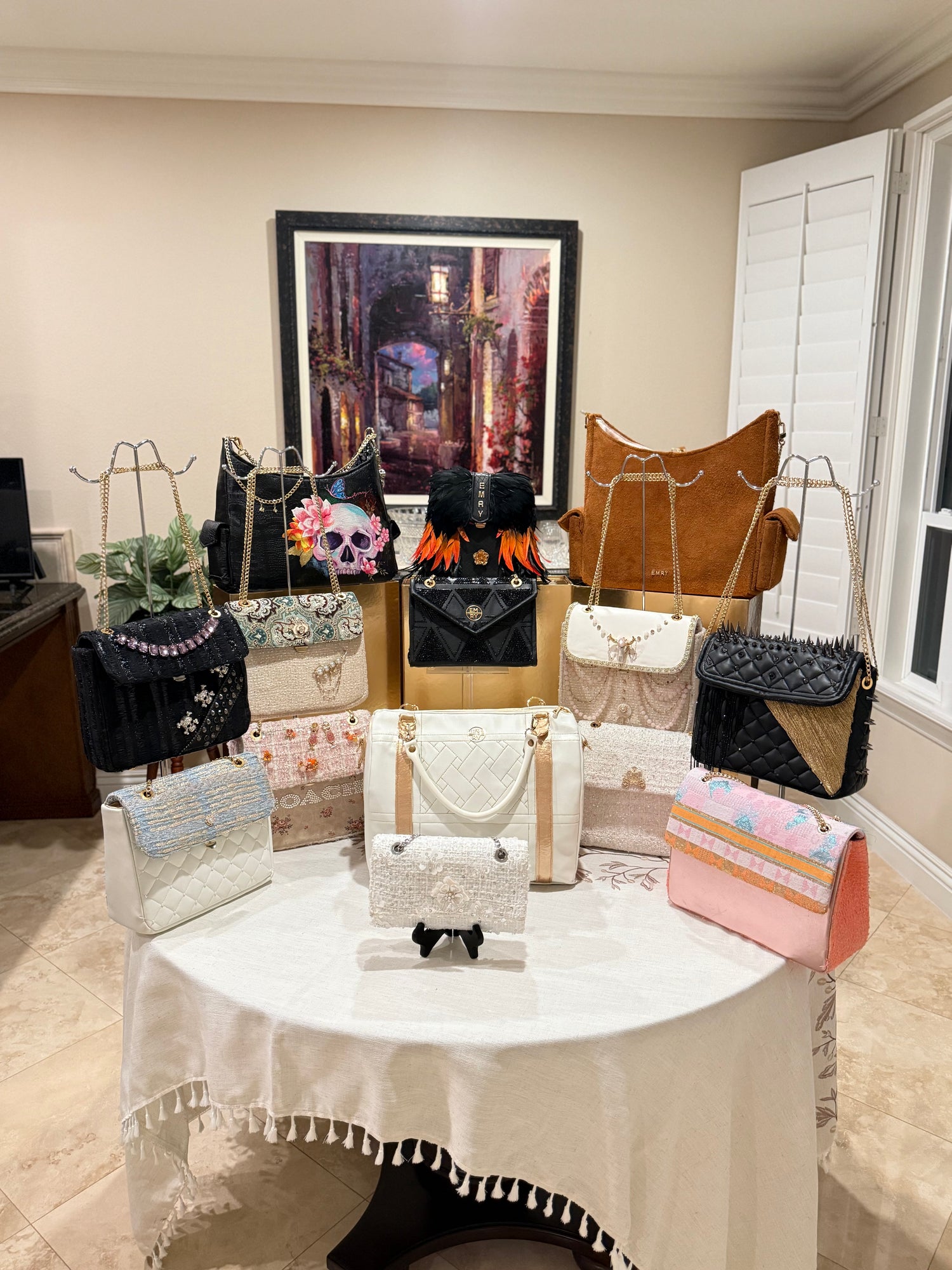 Bring the EMRY atelier into your home. Purse parties offer a private setting to see, touch, and select fabrics, hardware, and finishes while designing a handbag that feels entirely your own. It’s a chance to experience the process up close, whether you’re shopping specialty designs or creating something custom.