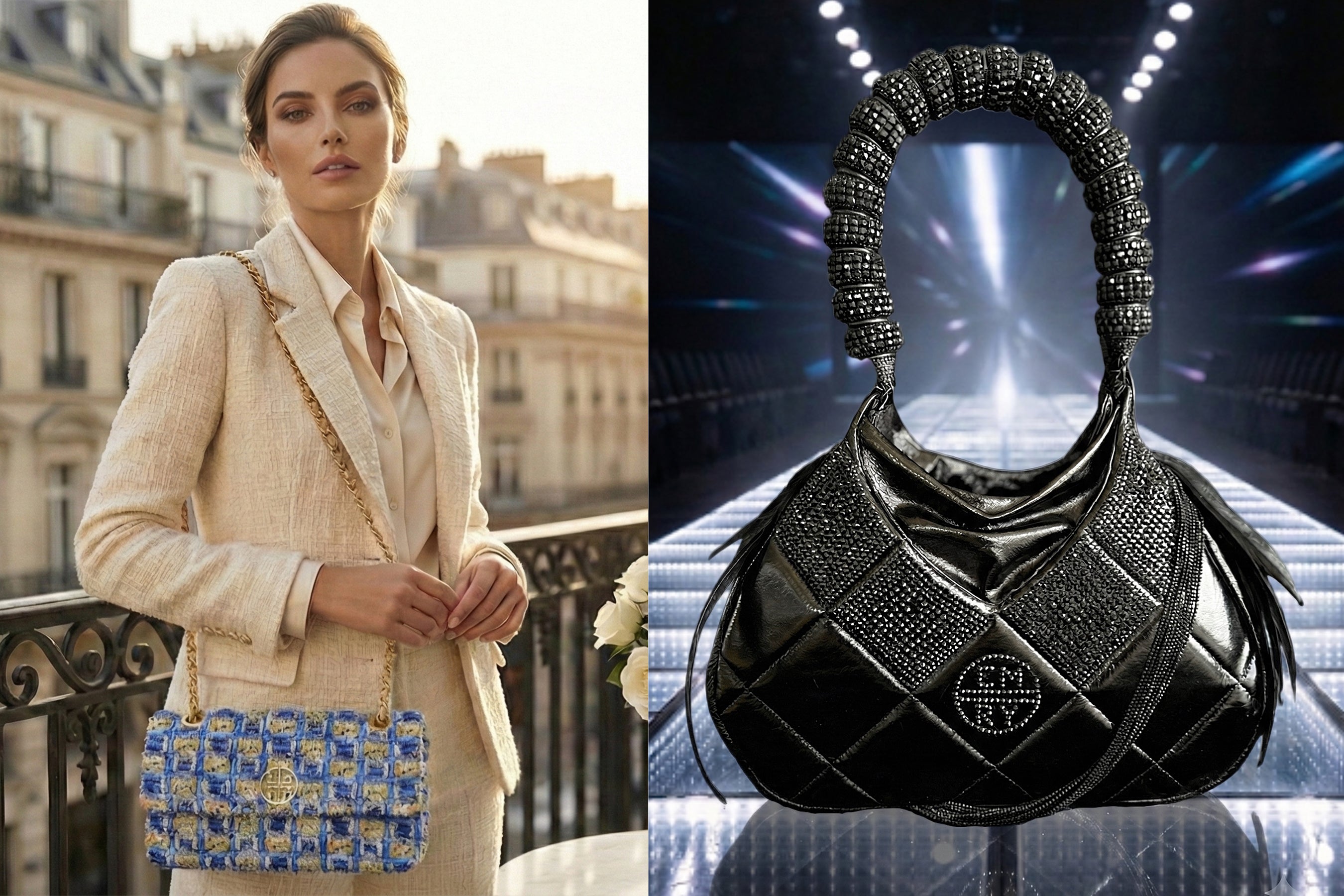 Luxury lives in the details. We source exclusively from the worlds finest fabric houses, including tweeds hand selected in Paris. Specialty leathers from high end tanneries include lambskin and exotic hides. Our hardware is solid jewelry quality 24k gold, sterling silver or stainless steel chosen to age beautifully alongside glittering Swarovski crystals