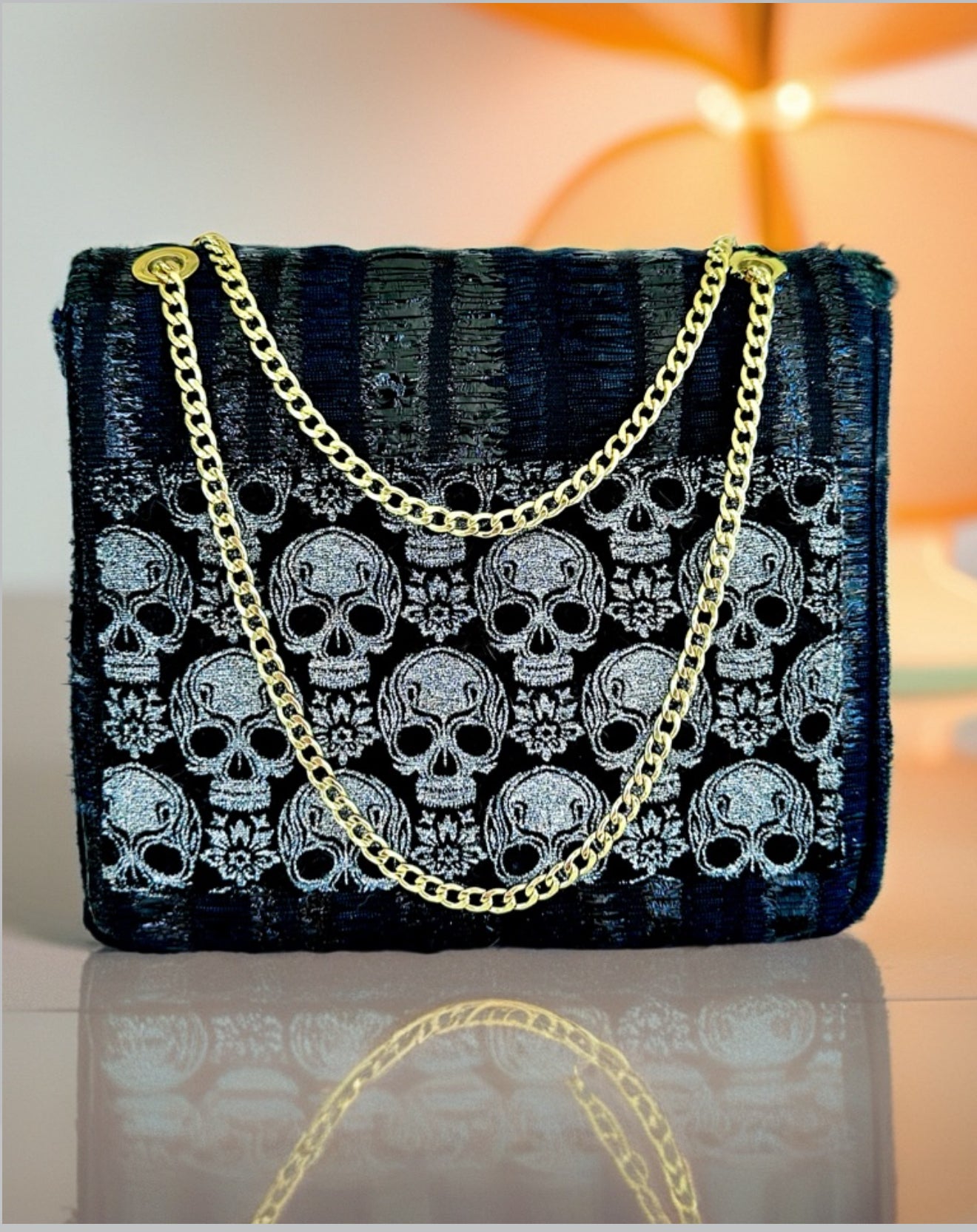 • Storage: Features a convenient exterior slip pocket (showcasing the intricate skull damask panel) and a secure interior zip pocket for your essentials.