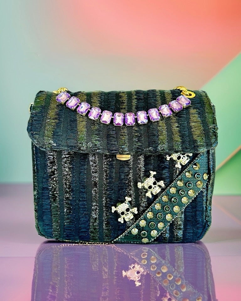 The classic elegance of the tweed is subverted by an unapologetic edge: rhinestone encrusted skulls that catch the light with every movement. A "necklace" of radiant purple crystals drapes across the front flap, adding a touch of regality to the rebellion.