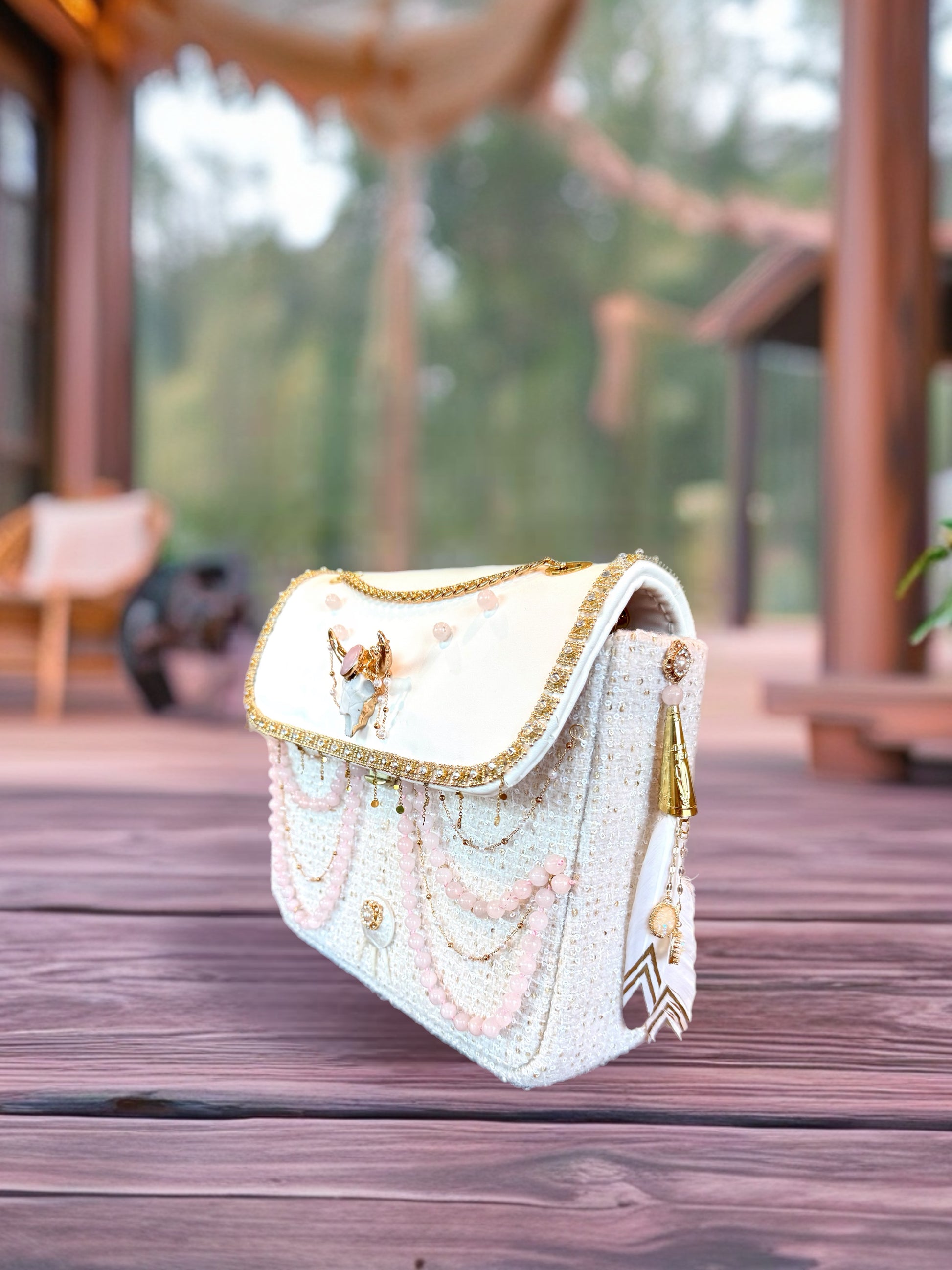 This bag is a soulful masterpiece for the modern bohemian. The design anchors on a striking, gold-horned bull skull motif, crowned with a semi-precious pink stone that serves as the bag's spiritual center. Beneath it, romantic swags of genuine rose quartz beads drape like a chandelier, creating soft, rhythmic movement against the rich texture of the cream tweed body.